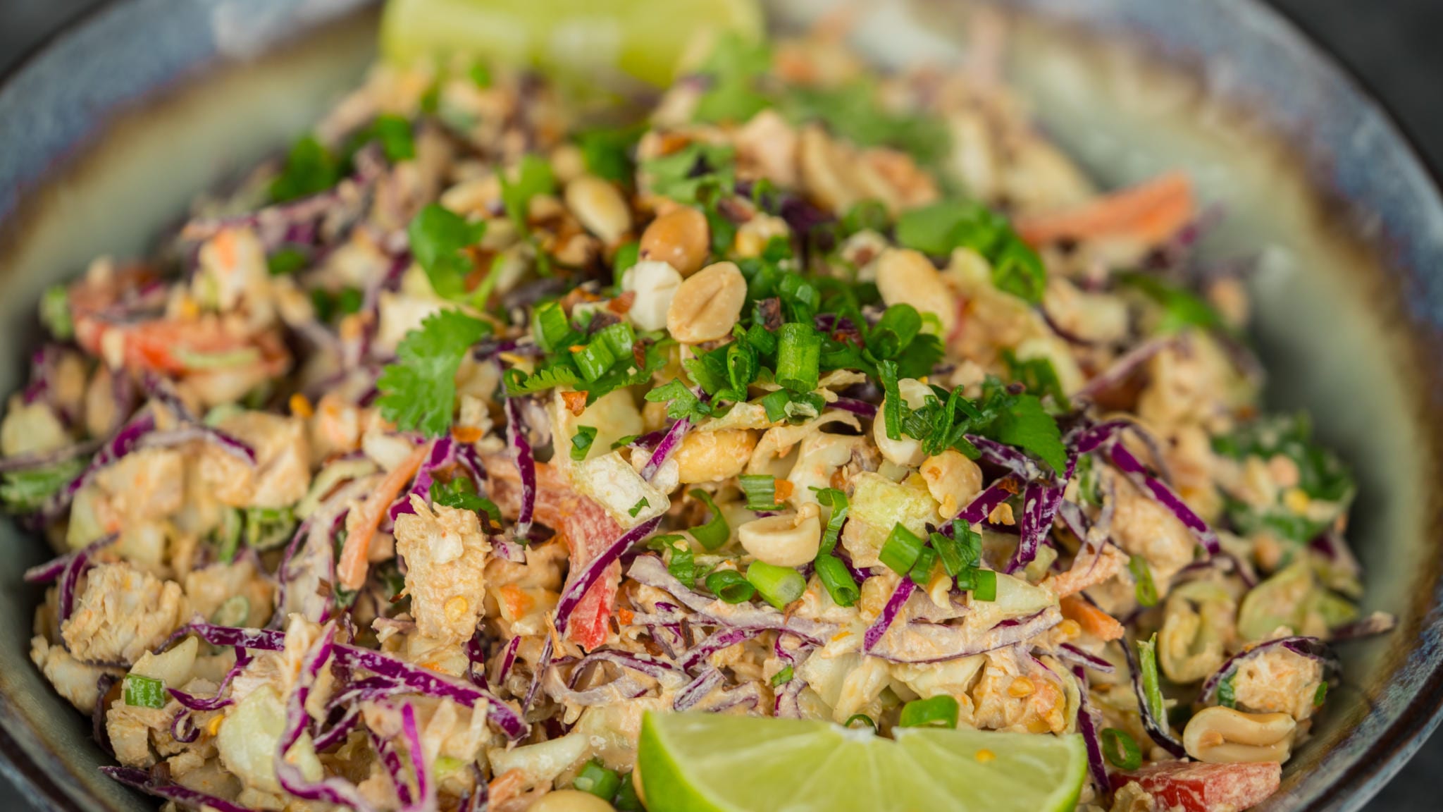 - Divide the salad between bowls and serve topped with the turkey and peanuts.