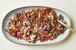 Step 1 – Roast the tofu. Preheat the oven to 375F degrees. Whisk together the ingredients for the baked tofu. Line a small baking sheet with parchment. Pat the tofu dry with paper towels and dip into the marinade, making sure to coat both sides. Place on the baking sheet and bake 10 minutes, or until the edges are just beginning to color and the marinade sets on the surface of the tofu. Remove from the oven and allow to cool. Turn the heat up to 425F degrees.