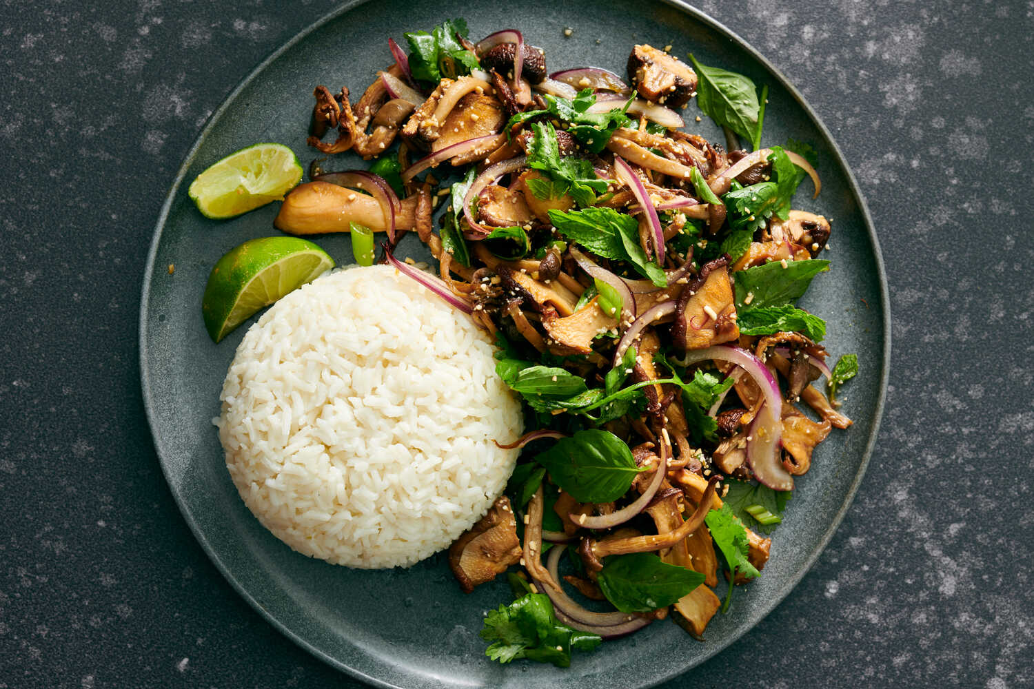 Mushrooms replace meat in this dish. A popular dish in northern and northeastern Thailand, pork is often a lively combination of cooked ground beef, fresh herbs and flavorful sauces. In this recipe, the mushrooms are roasted until golden and crispy on the edges, and once cooled, sprinkled with a mixture of cilantro, mint, basil, and spices, including chopped onions. The lime juice and soy sauce keep the sauce sharp and tangy. The light, crunchy taste of roasted ground rice is an important part of a salad, so don’t skip this step. Serve with white rice and additional lime wedges for squeezing.